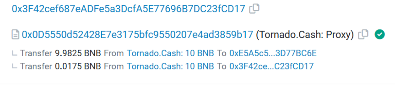 0x6ae8F988 的资金部分来自于 0xa6764FBbbFD89AEeBac25FCbB69d3E9438395e57 ,该地址的资金又是来自于 0xE5A5c50980176Cc32573c993D0b99a843D77BC6E 。地址 0xE5A5c509 的资金是由 Tornado Cash 地址提供,资金为 10 BNB。除了 Tornado 提供的资金外,还有一部分通过钓鱼和代币 Rug Pull 获得的利润。