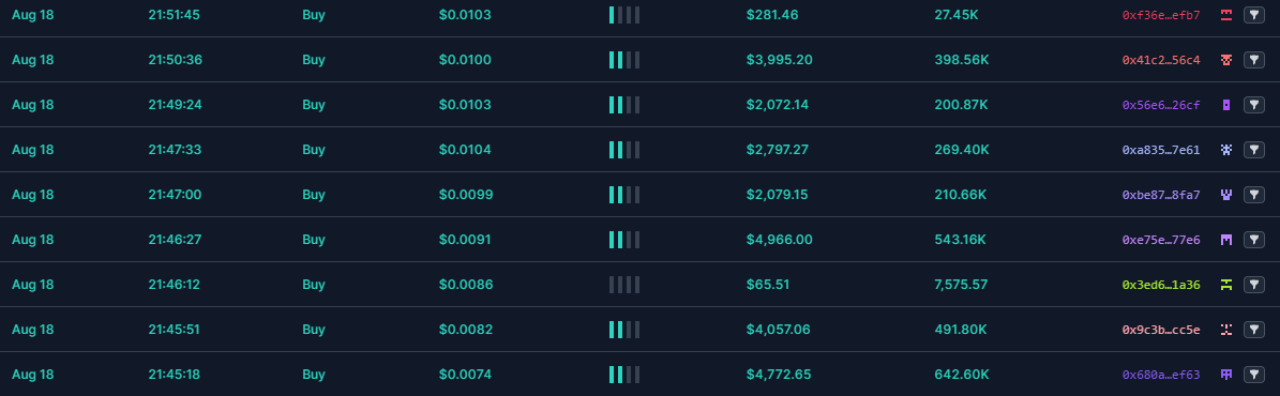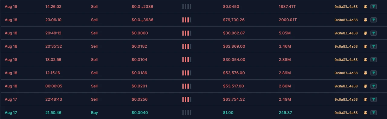 和 SEI 一样,代币的价格达到一定的数值时,代币所有者进场 sell 操作进行 Rugpull。可以从下图看出,进场收割时间段和价格都不同。