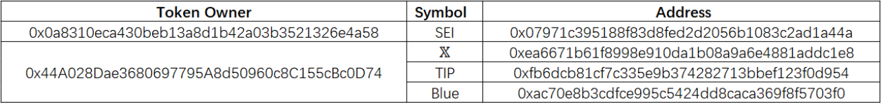 SEI、X、TIP 和 Blue 代币的所有者地址、符号和合约地址如下图所示。其中,X、TIP 和 Blue 的所有者地址为: