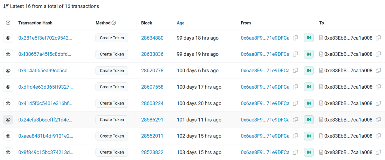 例如,0x 04067 B 4 fcC 9 f 3d 99 aC 5211 cfE 8 d 3 e 8687 B 0401 d 3 的资金来自于 0x 6 ae 8 F 98830894518 c 939 B 0 D 0 A 5 EF 11 c 671 e 9 DFCa。而 0x6ae8F988 创建了工厂合约 0x e 83 EbBb 4 acc 3d 8 B 237923 Ee 33 3D 04 B 887 ca 1 a 008 。该工厂合约也进行了相同的代币创建行为: