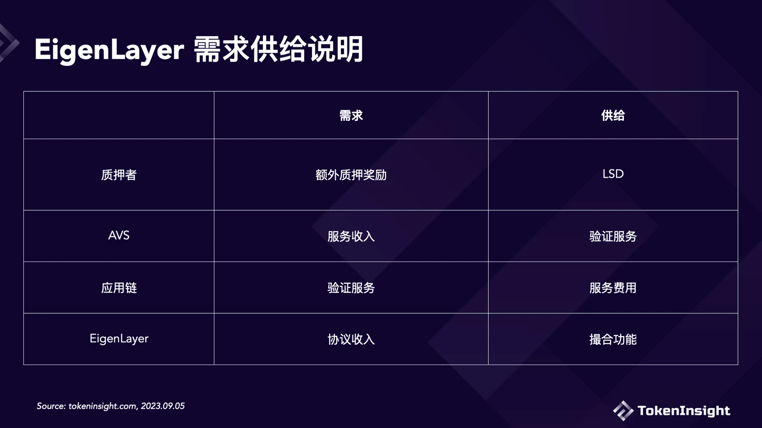 EigenLayer 的商业模型是围绕质押者、AVS 和应用链建立的。如果从需求和供给的角度来理解: