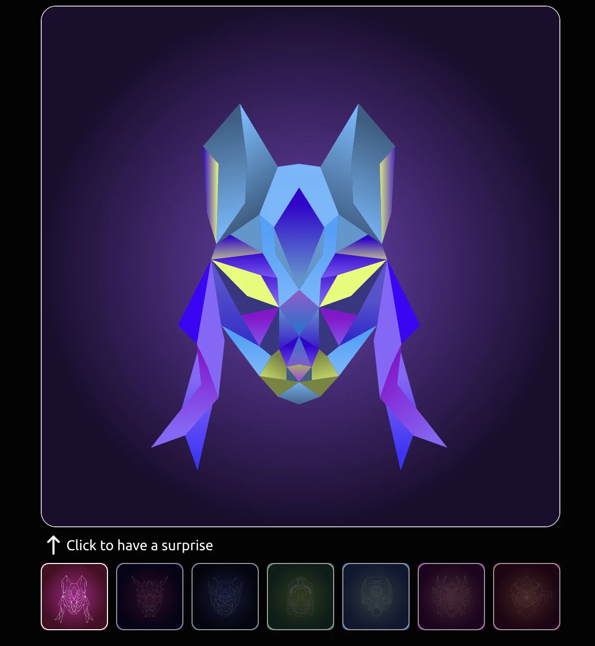 算法部分的基本原理在于将用户钱包地址作为种子,运用随机函数创造多种不同的颜色组合,以用来为面具模型上色。