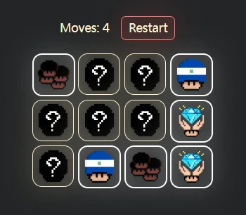 如图所示,该游戏为 3* 4 数位方格(此为简单模式,复杂模式为 6* 6 数位方格),一次可以点开两个方格,当两个方格图片相同时,则固定下来显示;不同时候,则直接显示为问号,在一定的点击次数内完成才算胜利。限制点击次数,来考验玩家的短期记忆力。此游戏类似大家熟悉的连连看游戏。这个游戏的 JS 和 HTML 全部铭刻在这个 Sat 里,但是其引用了“背景图片”(background image 如下图所示),所以是递归铭文的一个简单应用。