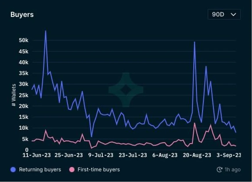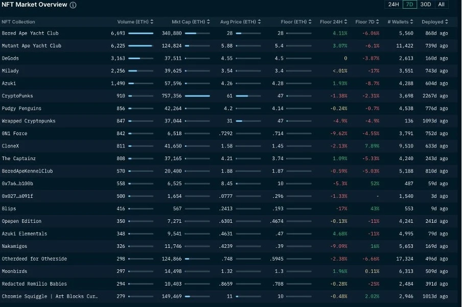 本周头部蓝筹项目地板价全部下跌, BAYC 和 MAYC 均下跌超过 6% , Milady 更是下跌了 17% 之多. 总钱包数量和复购买家均成下跌趋势, 整体市场行情也影响到了初次购买者的数量和积极性.