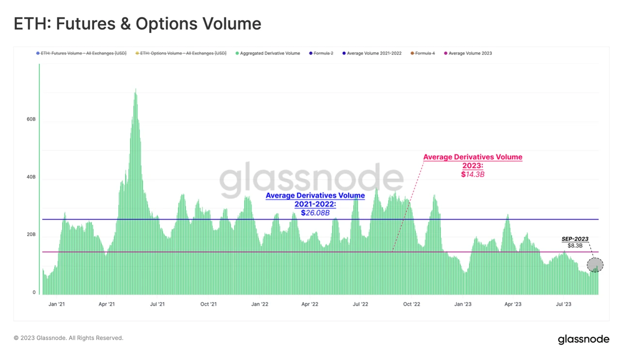 衍生品市场的风险偏好下降。23 年 ETH 期货市场活动明显低于 21-22 年水平,平均日交易量已降至过去两年的一半。现货市场资金持续外流,衍生品市场流动性持续下降。总体而言,投资者似乎对重返市场犹豫不决。