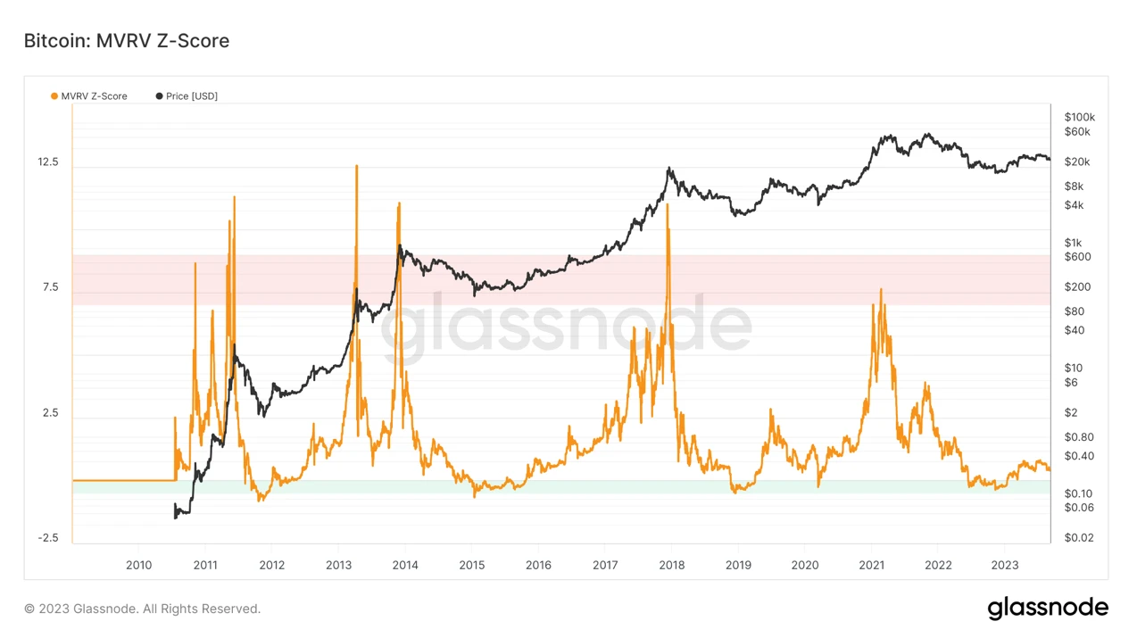 长期趋势指标 MVRV-ZScore 以市场总成本作为依据,反映市场总体盈利状态。当指标大于 6 时,是顶部区间;当指标小于 2 时,是底部区间。MVRV 跌破关键水平 1 ,持有者总体上处于亏损状态。当前指标为 0.4 ,进入复苏阶段。