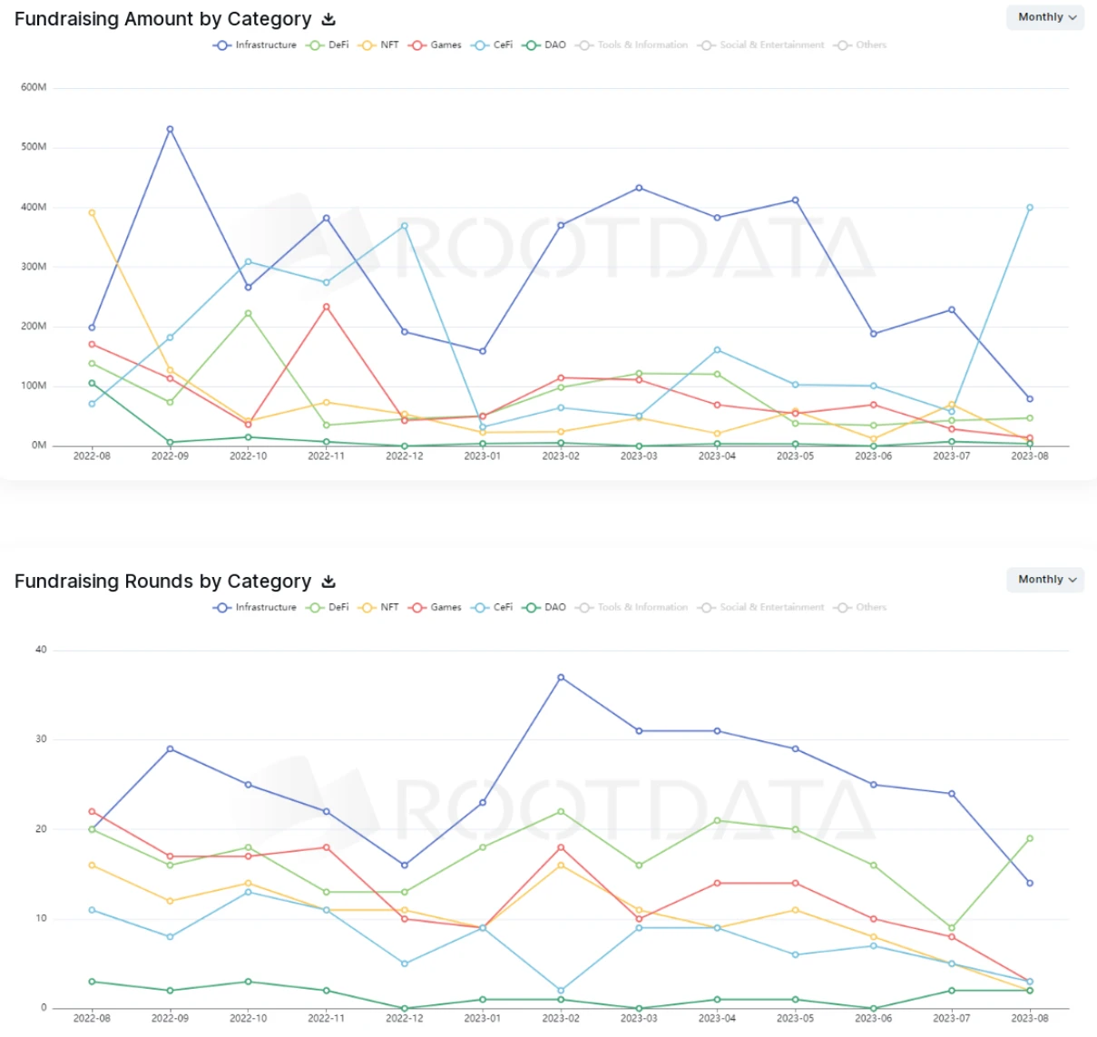 自 2021 年 GameFi 迎来爆发以来该赛道成为了彼时玩家掘金的热土, 而 GameFi 赛道在经历了短暂的增长后,逐渐的走向下坡路,该赛道不再是玩家们掘金的最佳选择。进入到 2023 年以来,GameFi 赛道始终表现的不温不火,尤其是进入到下半年以来市场进入深熊,GameFi 赛道的月融资金额、融资笔数不断创下新低,玩家游戏活性同样低迷。此外,GameFi、链游、P2E 等热词在各大社群出现的频率不断下降, “门可罗雀”的 GameFi 市场,也与两年前形成了十分鲜明的对比。