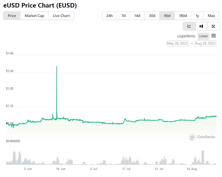 2、eUSD 持币可以获得利息使得铸币者持币意愿强(铸币者放弃持币意味着放弃全部抵押品收益),市场购买意愿强(相较于 USDT 等不生息稳定币,持有 eUSD 可以获得年化 7% -10% 的收益率),叠加协议持续购买 eUSD 用做利息分配使得 eUSD 长期正溢价;