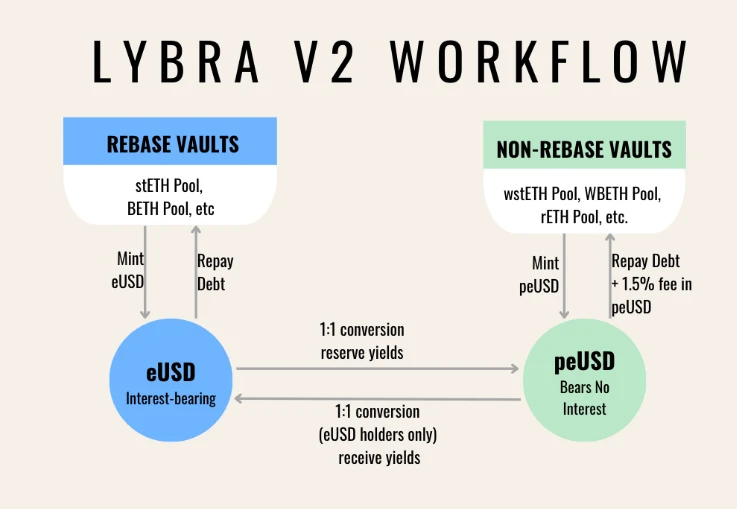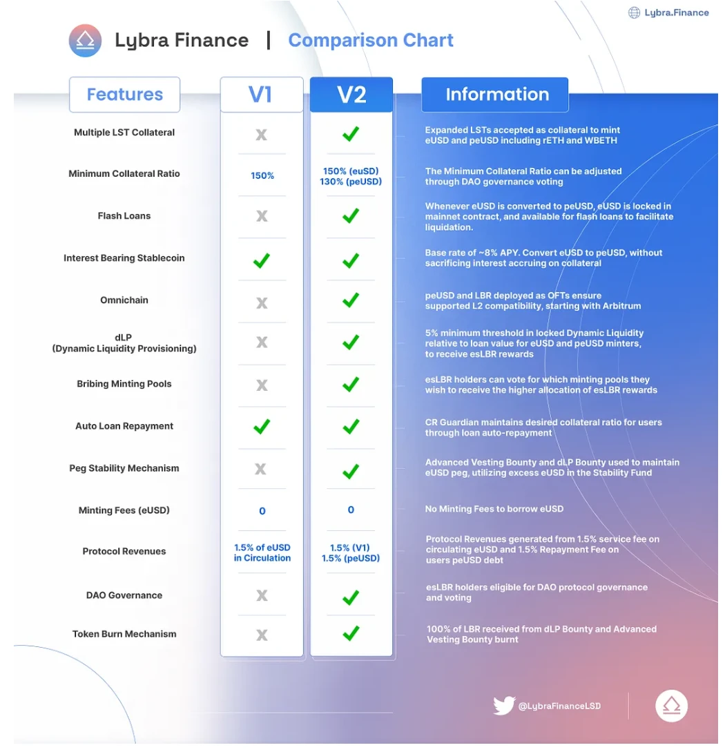 Lybra V2目前由 Cod 4 rena 和 Consensys 的代码审计已经完成, Halborn 的最后审计即将结束;确认将会于 8 月底上线。主要功能更新包括推出 peUSD 支持非 rebase 的 LST、上线 Abitrum、引入 LBR War 通过治理控制代币排放(类似 Curve War)、引入提前解锁罚金与 dLP 罚金,以此引入 LBR 燃烧与 eUSD 价格稳定基金等。