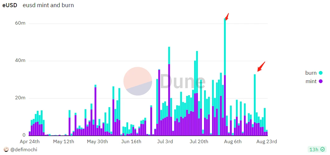 3、stETH 抵押品利息收归协议兑换成 eUSD 分配给 eUSD 持有者使得铸币者为了利益最大化通常选择最高的杠杆率,使得整个协议抵押率 CR 太低极易触发清算; 在最近 8 月 2 日与 8 月 17 日 ETH 单日出现较大跌幅,eUSD 均出现了大额清算,这在导致铸币人收损失的同时也提高了协议的坏账风险。