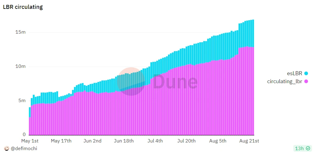 1、eUSD 铸币的收益风险不平衡: Lybra V1收取铸币者抵押品产生的利息抽水 1.5% 归协议收入,剩余部分兑换为 eUSD 分配给 eUSD 的持有人实现生息稳定币的功能。这导致对于 eUSD 的铸币人来说损失了 1.5% 的利息收入同时承担了合约风险,为了激励铸币行为需要 esLBR 补贴,这会造成 LBR 流通量的严重通胀;从 5 月初到现在(8 月 23 日),LBR 流通量从 4.33 m 上升至 12.87 m,通胀 297% ,LBR+esLBR 从 5.42 m 上升至 16.9 m,通胀 312% 。