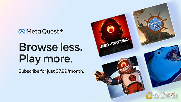 今年6月26日,Meta正式推出了名为“Meta Quest+”的游戏订阅服务,用户每月支付7.99美元即可畅玩2款游戏,而且精选游戏库的内容还会随时间不断扩充,截至9月该库的游戏数量为6款,包含《Red Matter》《A Fisherman's Tale》等,堪称每款都是精品——订阅制正是近几年来家用机游戏厂商所力推的付费模式。