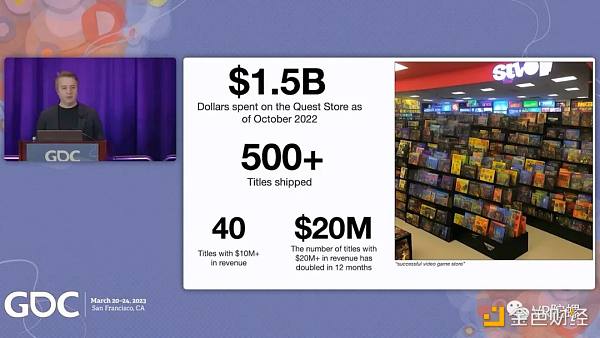 根据Meta在GDC 2023上公开的最新数据:目前Quest Store上的游戏、应用数量已经达到500余款,总营收额达到15亿美元,其中有40款的收入超过了1000万美元。在过去1年内,收入达2000万美元的游戏数量同比翻了一番。——详情参看:Meta内容生态系统总监:想跨越鸿沟?内容为王,品质至上