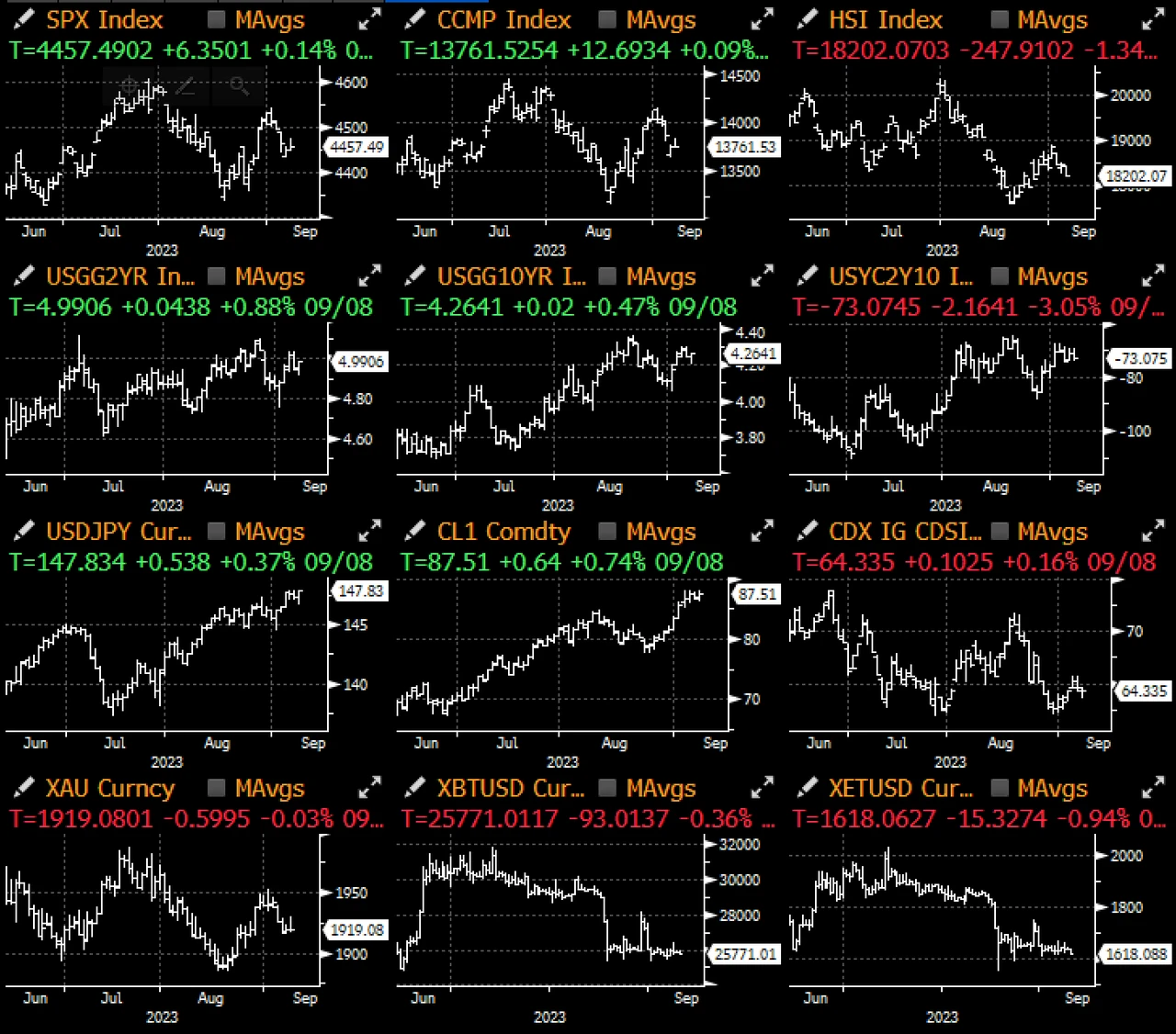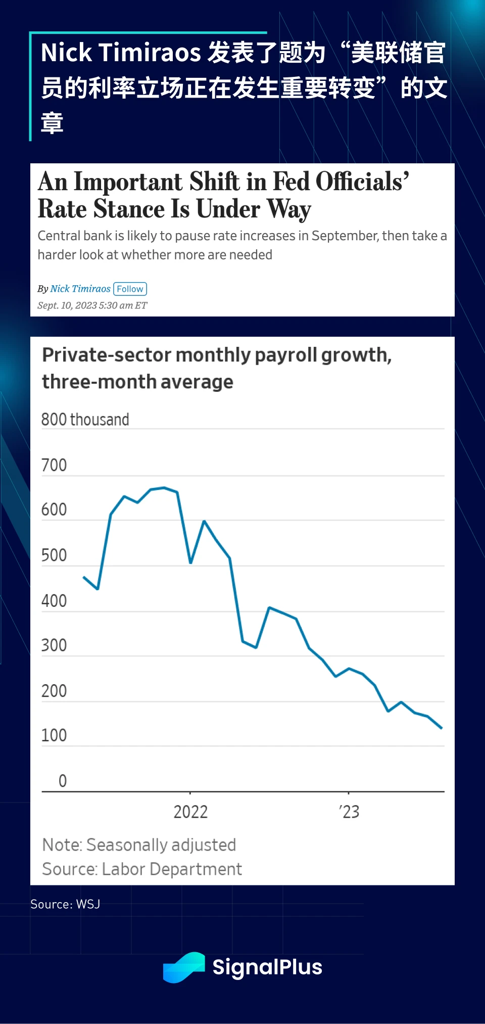 此外,著名的美联储观察家 Nick Timiraos 撰写并发布了一篇题为“美联储官员的利率立场正在发生重要转变”的文章,认为近期薪资增长的放缓足以使美联储的立场转向更为平衡的观点;9 月加息的可能性回落至 5% ,而根据利率期货定价,市场对 11 月会议的看法仍为 50/50 。