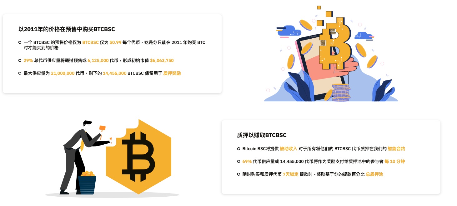 这Bitcoin BSC预售价格为每个代币0.99美元,相当于2011年比特币价格,总供应量29%将在预售中出售,剩余留作质押奖励。看到没,这是一个公平投资升值机会,潜在升幅有几十倍呢!