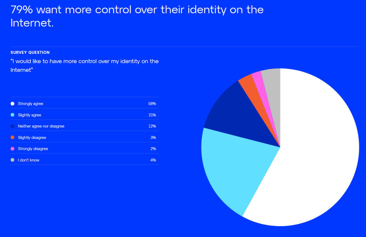 生活的方方面面都涉及某种身份识别——从住房到就业,到教育,再到病史。今天网络上的身份需要你证明你就是你所说的那个人。我们的数字身份由你在网络上使用的服务和社交媒体平台拥有和控制,通常不会全部存储在一个位置并由个人自己拥有。绝大多数受访者都希望在互联网上更好地控制自己的身份。