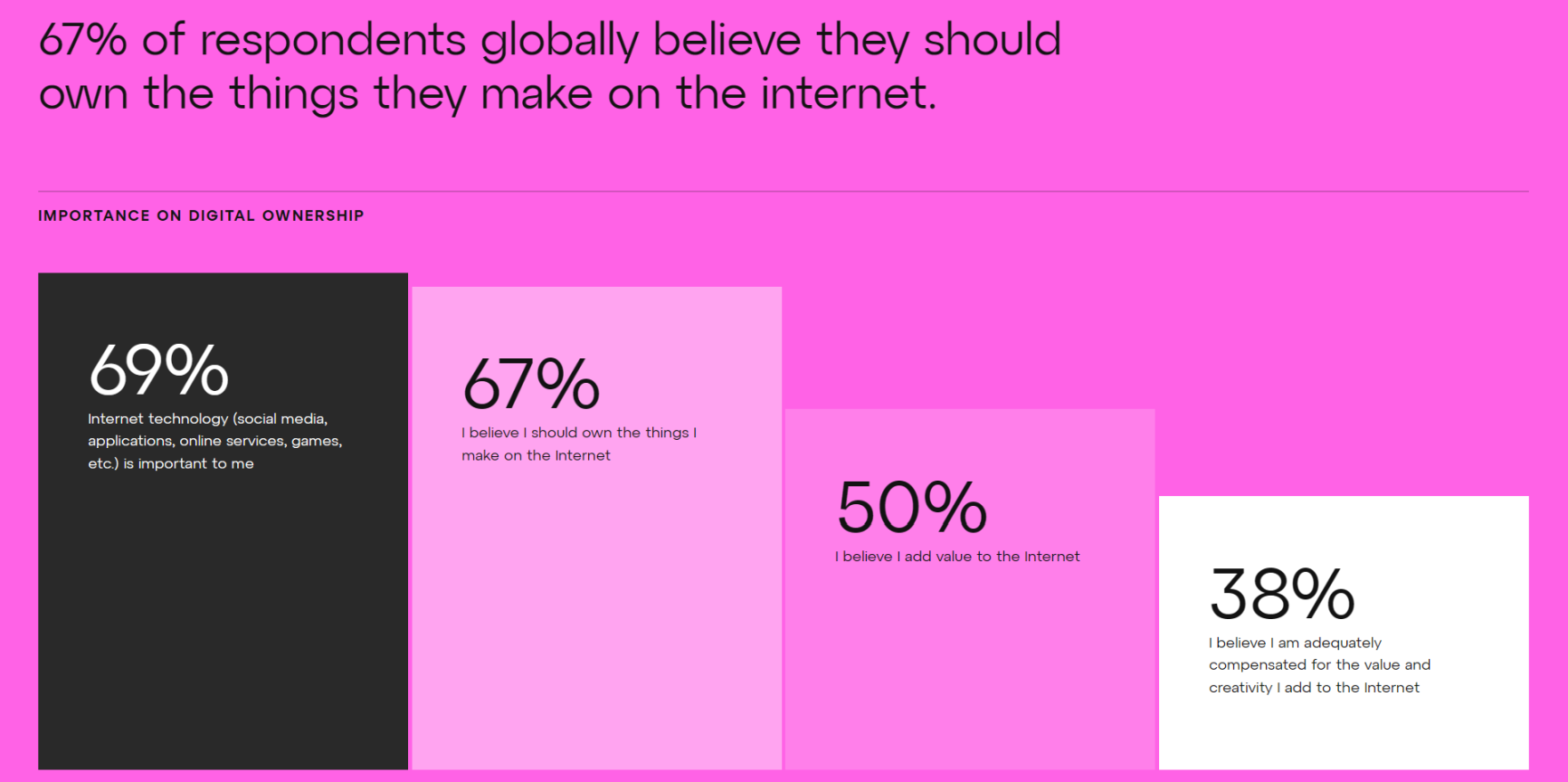 尽管许多受访者不知道 Web3,但许多人支持 Web3 的基本概念。50% 的人认为他们为互联网增加了价值, 67% 的人声称他们应该拥有他们在互联网上创作的东西。