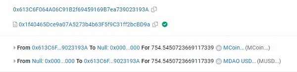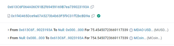 4.0x613C地址能将MCoin兑换为相同数量的MUSD。