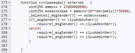 ccvipaaaqqq()函数会给调用者添加巨量的CUZK代币,并且最后判断调用者是否为ciyuAdmintmrr,该地址是合约初始化时创建者设置的地址(0xf719)。