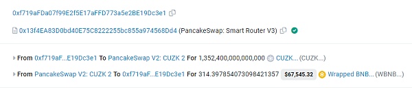 随后,特权地址使用设置的代币将pair中WBNB全部兑换出来,导致CUZK币价归零。