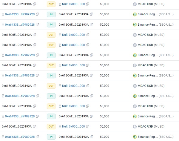 5.通过多次转换,0x613C拥有了大量的MUSD,最后将USDT全部兑换出来。