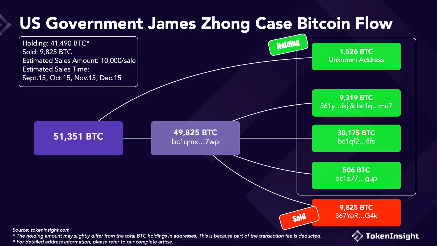 根据法院文件,今年美国政府还有 4 次关于 James Zhong Case 比特币的出售计划。从链上数据上看,目前已经接近九月中旬,持有 James Zhong Case 比特币的 4 个地址还暂无任何交易活动。因此我们推测有两种可能情况: