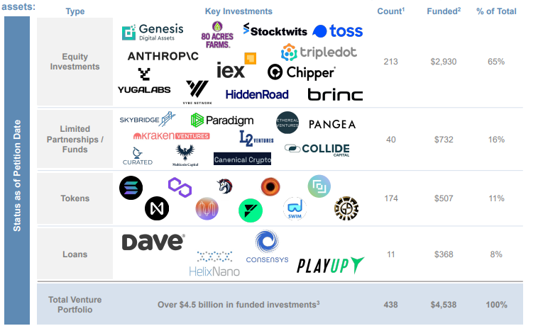股权投资占剩余风险投资的 73% ,共有 202 笔投资。其中主要为 11.52 亿美元的 Genesis Digital;5 亿美元的 Anthropic ;1.11 亿美元的 Voyager Digital 等。