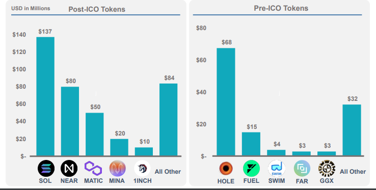 代币投资占剩余风险投资的 13% ,共有 171 笔投资,平均投资规模为 300 万美元。其中主要包括 Solana 1.37 亿美元; NEAR 8000 万美元;Hole 6800 万美元等。