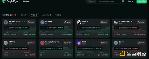 第一步,打开EagleEye平台,通过Hot Project服务,你发现所感兴趣的这个项目的 流动性、币价涨幅、巨鲸交易都在持续上升 ,所以可以进行深入研究。
