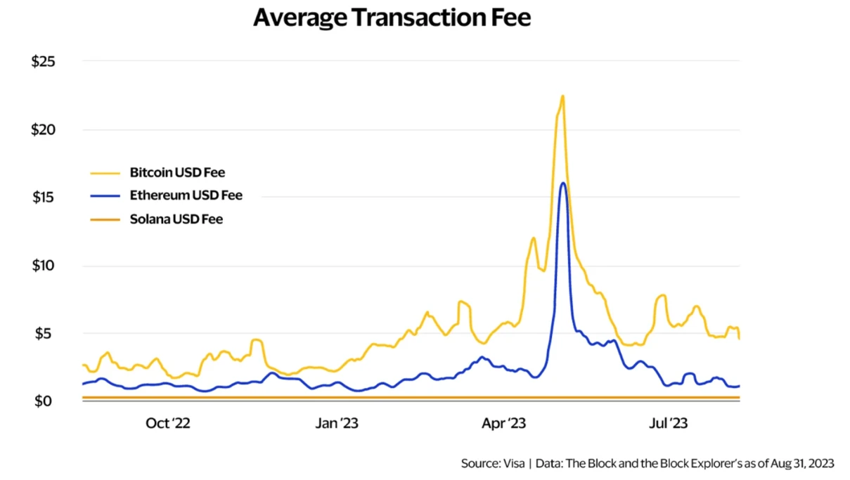 在下图中,从成本的角度来看,Solana 与比特币和以太坊相比显然更为突出,后两者的交易费用可能根据在网络上执行的交易需求而不可预测地波动。 交易成本不可预测的网络可能对支付公司在其产品中进行管理更加困难,并可能导致消费者体验混乱 。