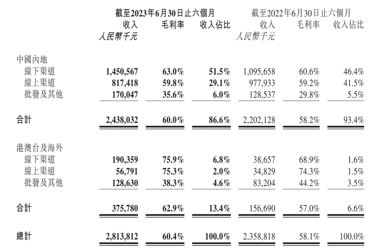 23 H 1 中国港澳台地区及海外收入 3.76 亿元,同比增速 139.8% ,收入占比从去年同期 6.6% %提升至 13.4% 。线下/线上/批发收入分别为 1.90/0.57/1.29 亿元,分别同比增长 392.4% /63.1% /54.6% 。泡泡玛特 CEO 王宁表示海外门店目前 100% 都是盈利状态,有信心今年海外业务做到 10 个亿。