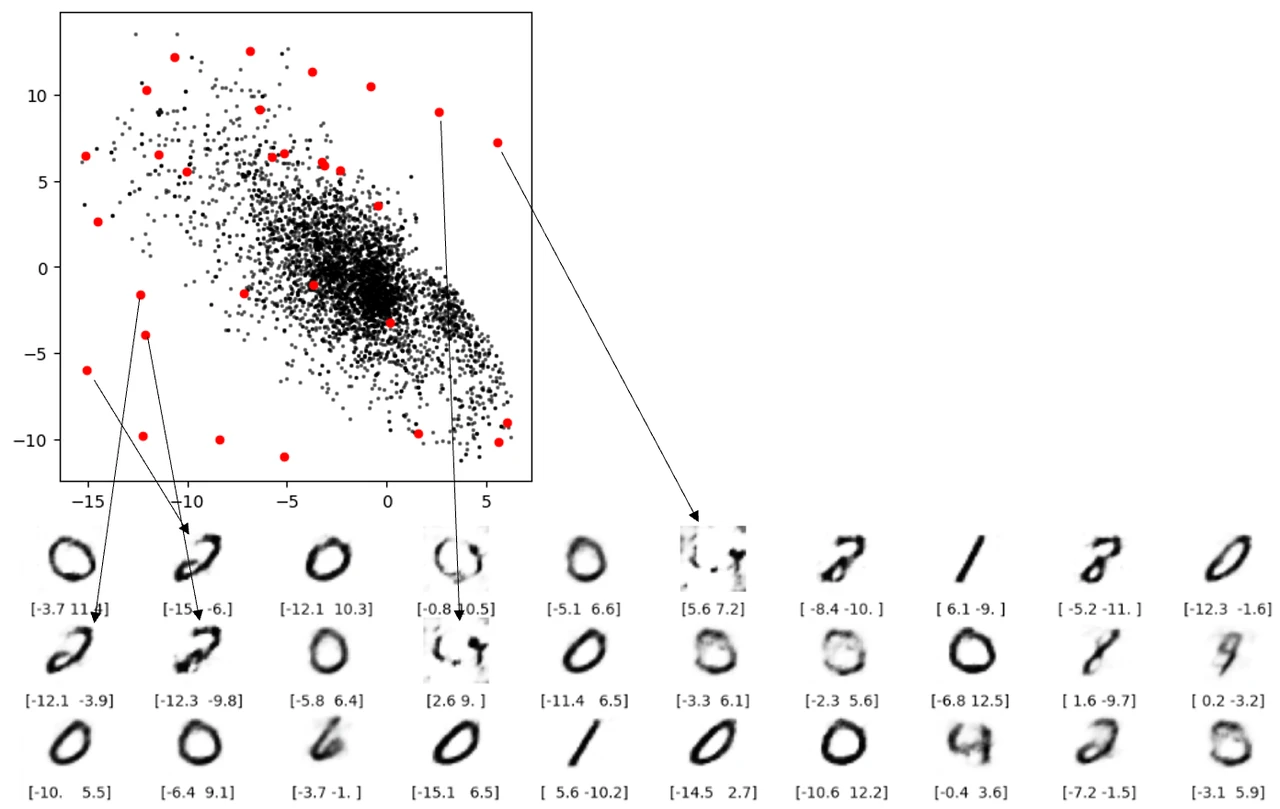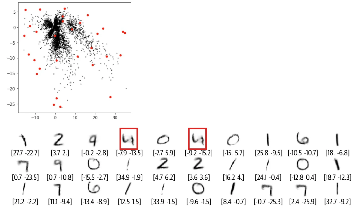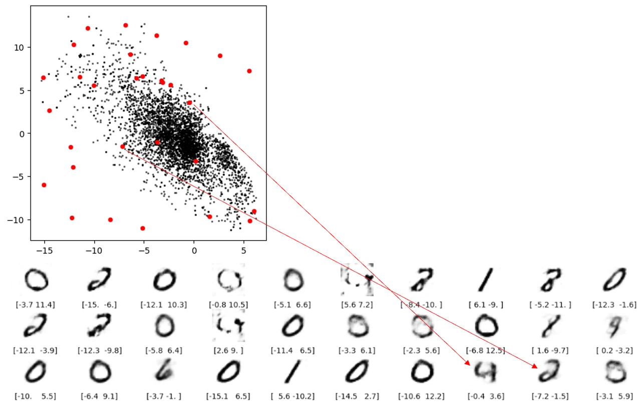 缺陷 3 空白出重构不出数字还好理解,但下图两条红线表示的重构就让人担忧了。这两个点都不在空白处,但是还是无法解码成像样的数字。根本原因就是自动编码器并没有强制确保生成的潜空间是连续的,例如,即便 ( 2,-2) 能够生成令人满意的数字 4 ,但该模型没有一个机制来确保点 ( 2.1, – 2.1) 也能产生令人满意的数字 4 。