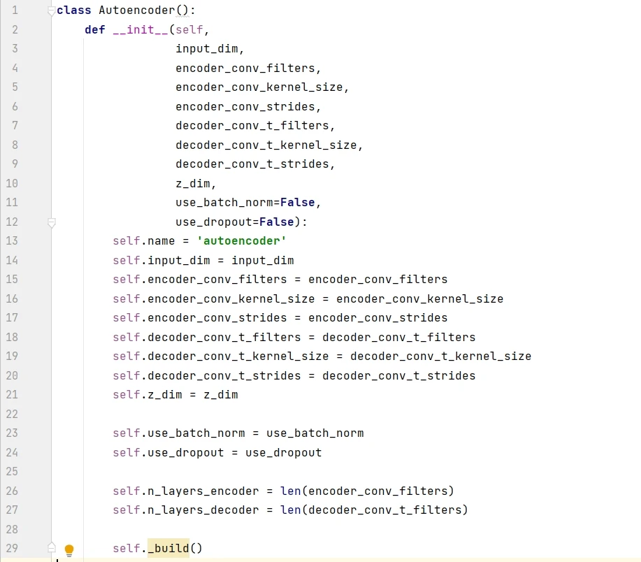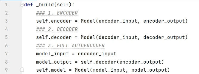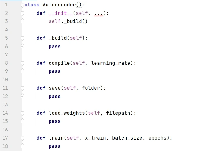 一般来说,最好用单独的文件来创建模型的类,比如下面的 Autoencoder class。这样其他项目可以灵活调用此类。下面代码首先展示了 Autoencoder 的框架,__init__() 是构造函数,通过调用 _build() 来创建模型,compile() 函数用于设定优化器,save() 函数用于保存模型,load_weights() 函数用于下次使用模型时加载权重,train() 函数用于训练模型。
