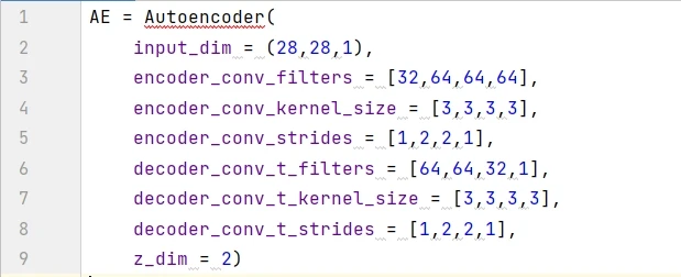 用构建函数创建自动编码器,命名为 AE。输入数据是黑白图片,其维度是 ( 28, 28, 1),潜空间用的 2D 平面,因此 z_dim = 2 。此外六个参数的值都是一个大小为 4 的列表,那么编码模型和解码模型都含有 4 层。