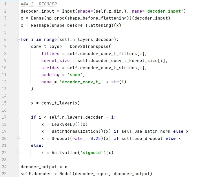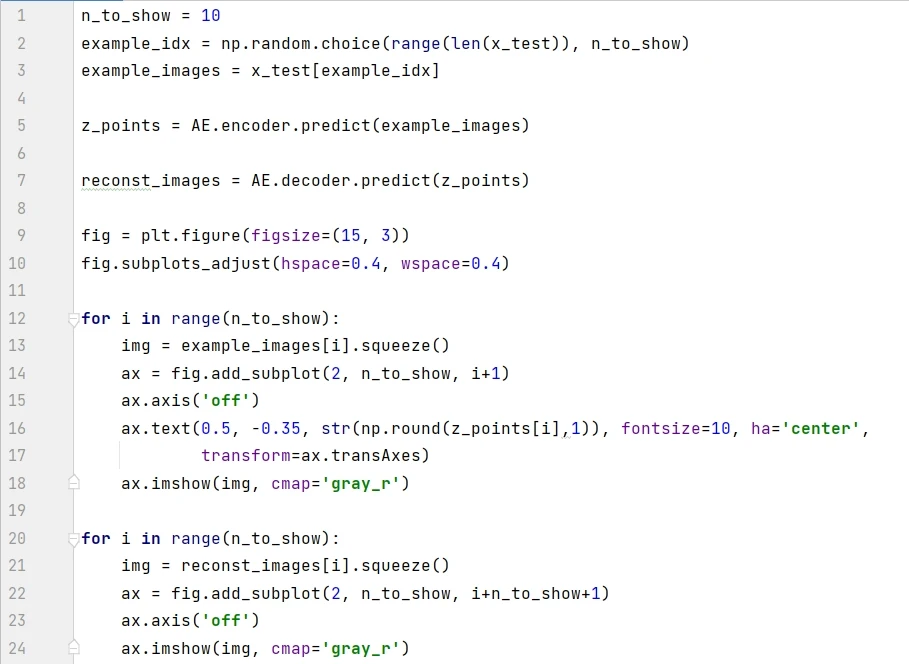第 24-25 行构建 decoder 模型,分别在 Model() 函数确定入参 decoder_input 和 decoder_output,前者是 encoder 的输出,即潜空间的点,而后者是重建的图片。