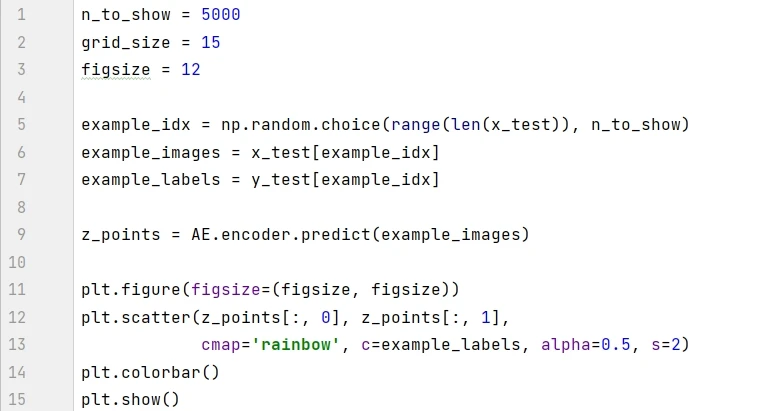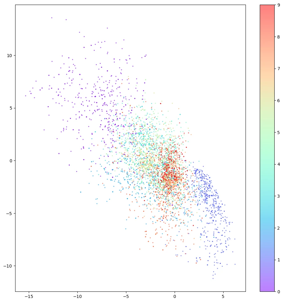 模型训练之后,我们可以可视化图片在潜空间的情况。通过模型中的 encoder 在测试集生成坐标在 2D 散点图中显示。