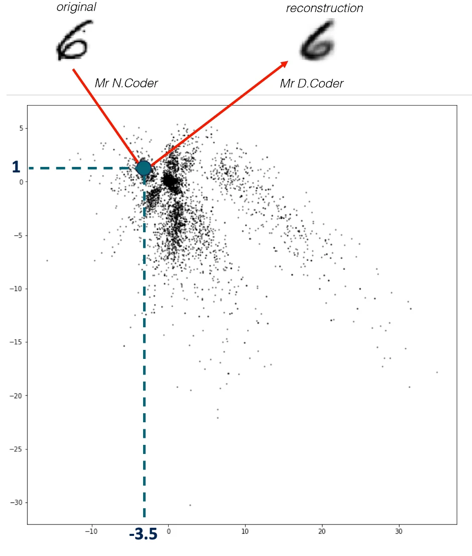 展墙如下图所示,每个黑点是 N.Coder 放置的一个标记,代表一幅画。在墙上坐标 [– 3.5, 1 ] 处的那幅原图 (original) 数字 6 的画 N.Coder 对其进行了重建 (reconstruction)。