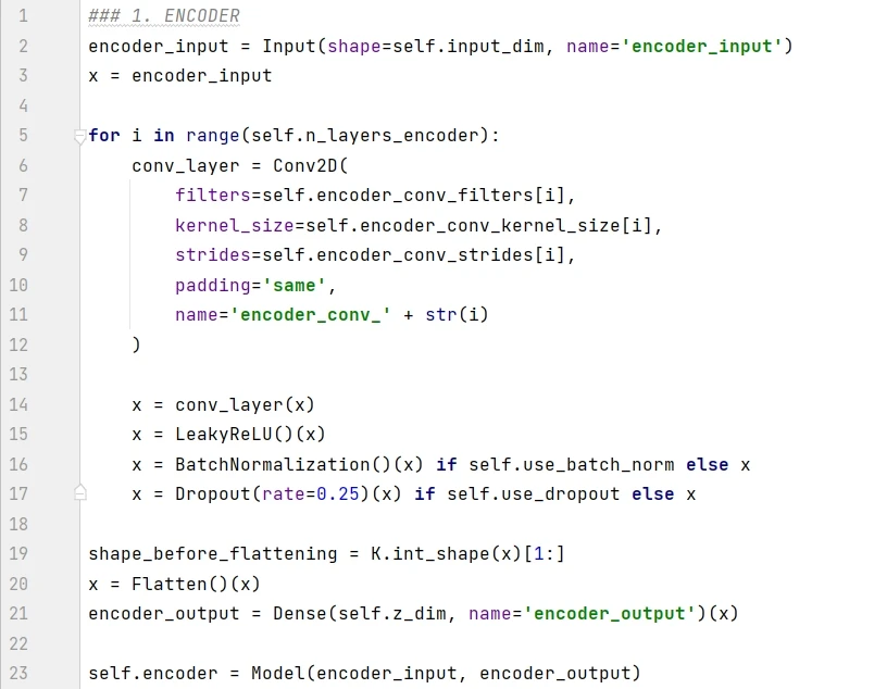编码器的任务是将输入图片转换成潜空间的一个点,编码模型在 _build() 函数里面的具体实现如下: