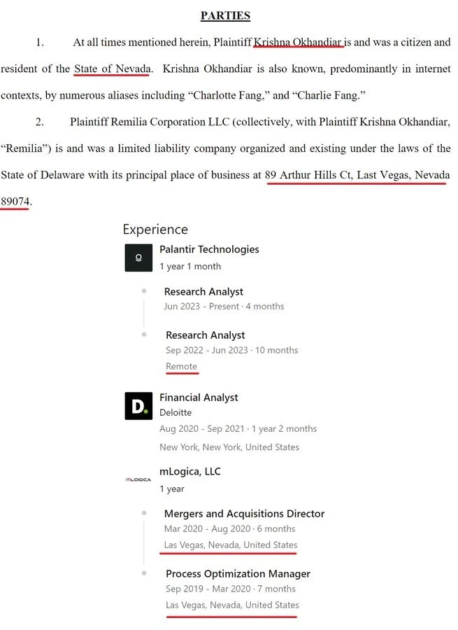 Charlotte 此前的真身就已被社区成员“开盒”,而在 Charlotte 发出的诉讼副本中,也确实能找到这个名字——Krishna okhandiarz 和母公司 Remilia Corporation LLC. 挂钩在一起。