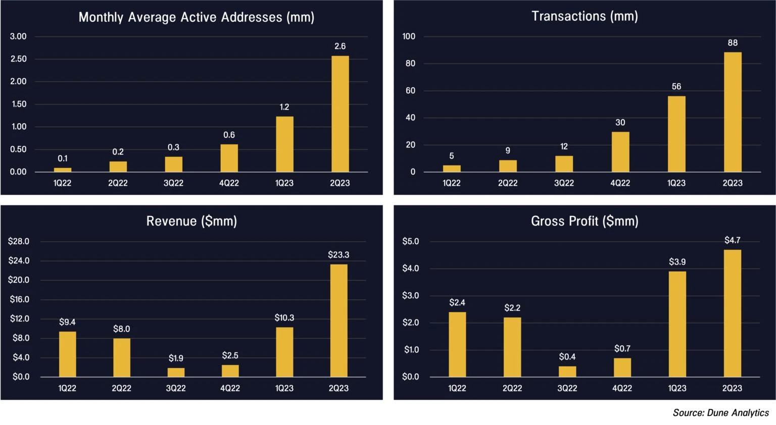 自从推出以来,活跃用户数量已经连续增长,每个季度的交易次数接近 9000 万次。第二季度的收入为 2300 万美元,毛利润在第二季度达到近 500 万美元,年化为 2000 万美元。这些是我们可以每天在区块链上跟踪和验证的关键绩效指标,以监测 Arbitrum 是否符合我们的投资论点和财务预测。