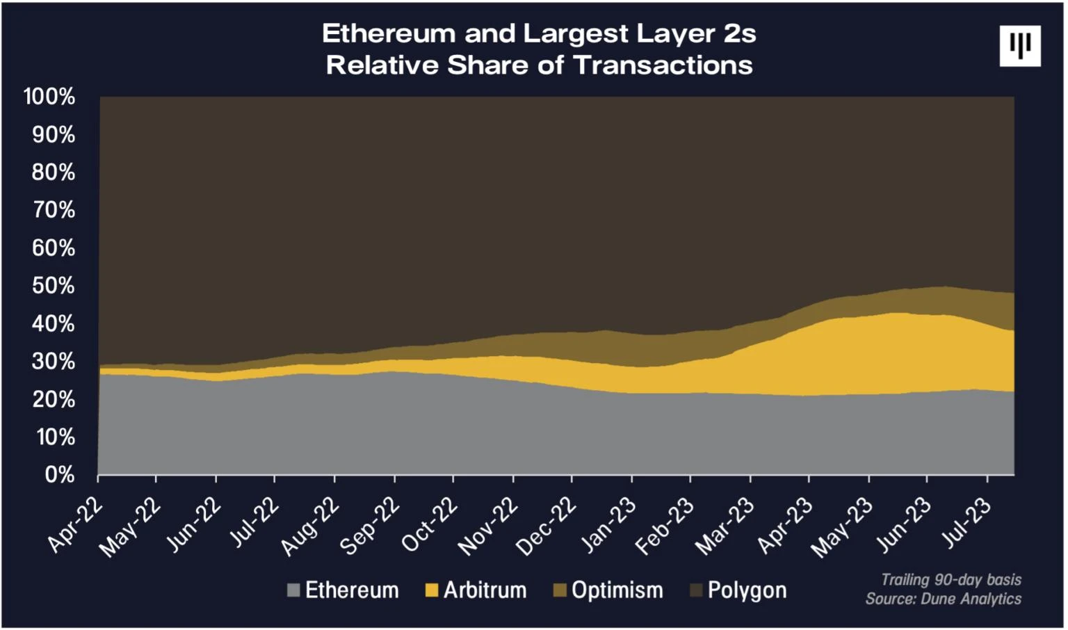 为了更深入探讨最后一点,Arbitrum 是少数几个在整个熊市期间显示交易量增长的链之一,而整体使用情况却相对疲弱。事实上,如果将数据分开来看,你会发现在以太坊及其所有其他第二层解决方案中,Arbitrum 今年实际上贡献了以太坊生态系统中增长的 100% 。Arbitrum 在以太坊生态系统内占据了巨大的份额,而以太坊本身则在整个加密货币领域占据了巨大的份额。