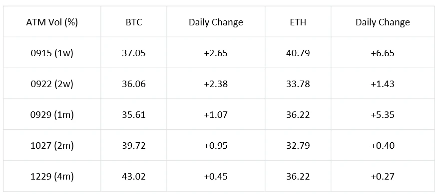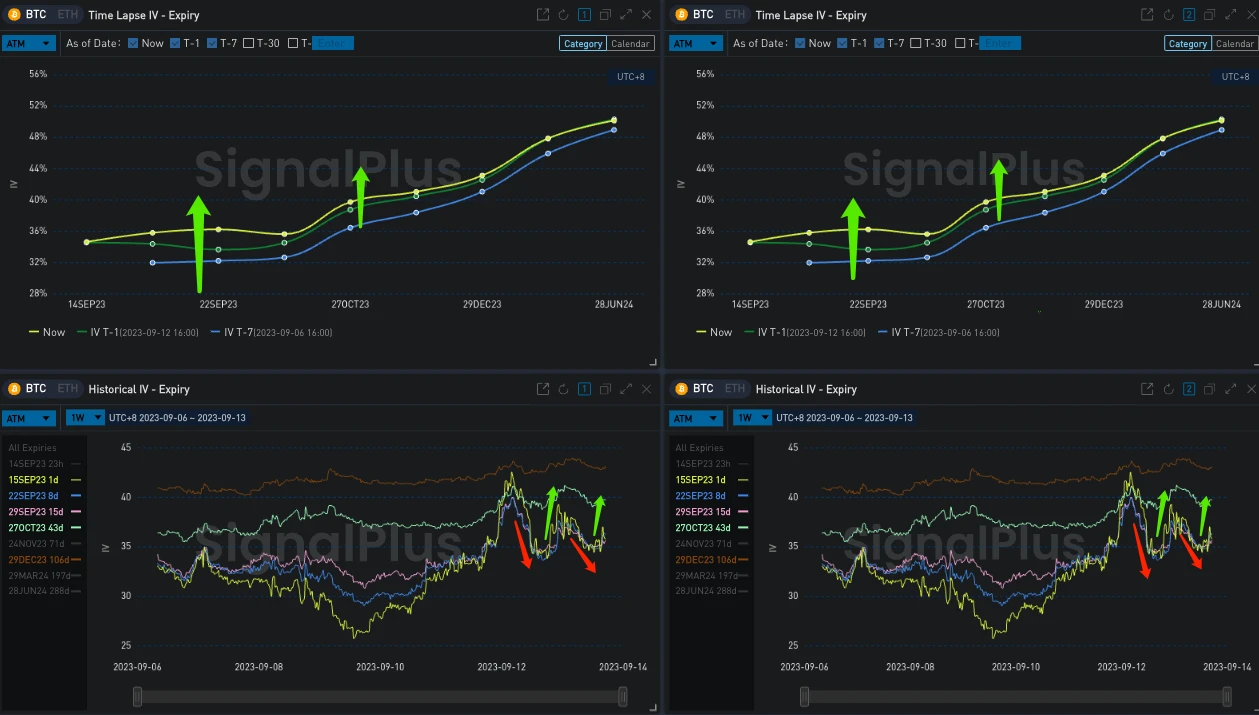 受美国数据发布以及近期价格波动的影响,中短期隐含波动率持续上涨,曲线走平,其中次周到期的 IV 在 FOMC 会议带来的不确定性加持下产生了更多的溢价,BTC/ETH 22 Sep 23 IV 日内分别上涨 2.38% /1.43% 。