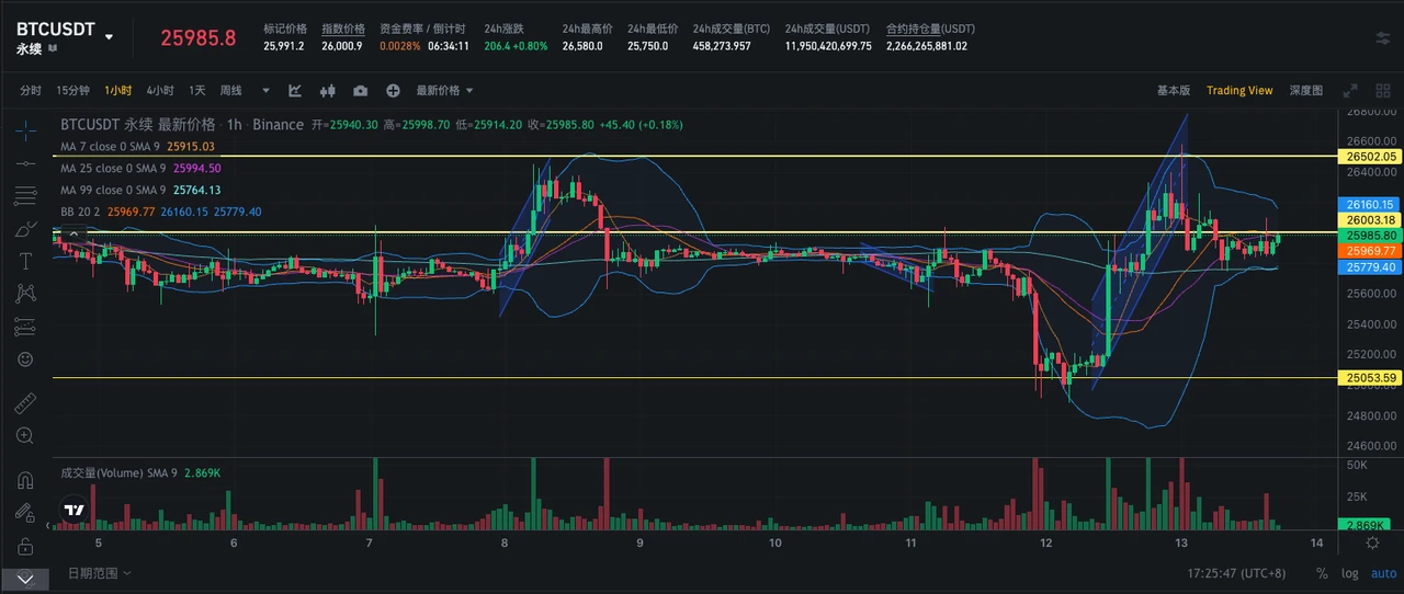与美股情况不同,数字货币方面,BTC 在昨日交割后延续了价格反弹带来的升势,一度突破 26500 关口,但随着这波看涨情绪逐渐褪去,价格从高点出现回落,重新回到 26000 阻力位下方整盘。