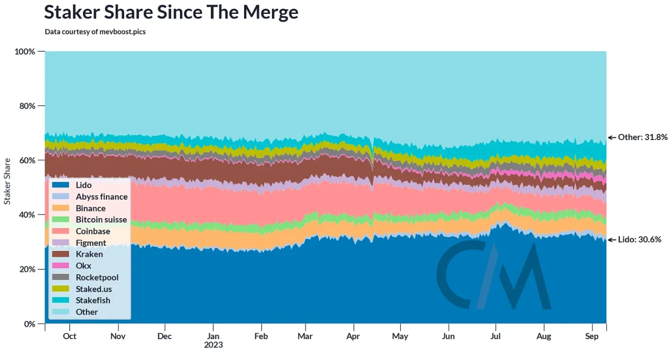 值得注意的事情之一是,迄今为止最大的验证者池位于 Lido 旗下,目前该验证者池占当前活跃验证者总数(787, 755 名)的 30.6% 。今年四月「Shapella」升级开放信标链提现后,一波新的验证者涌入以太坊。