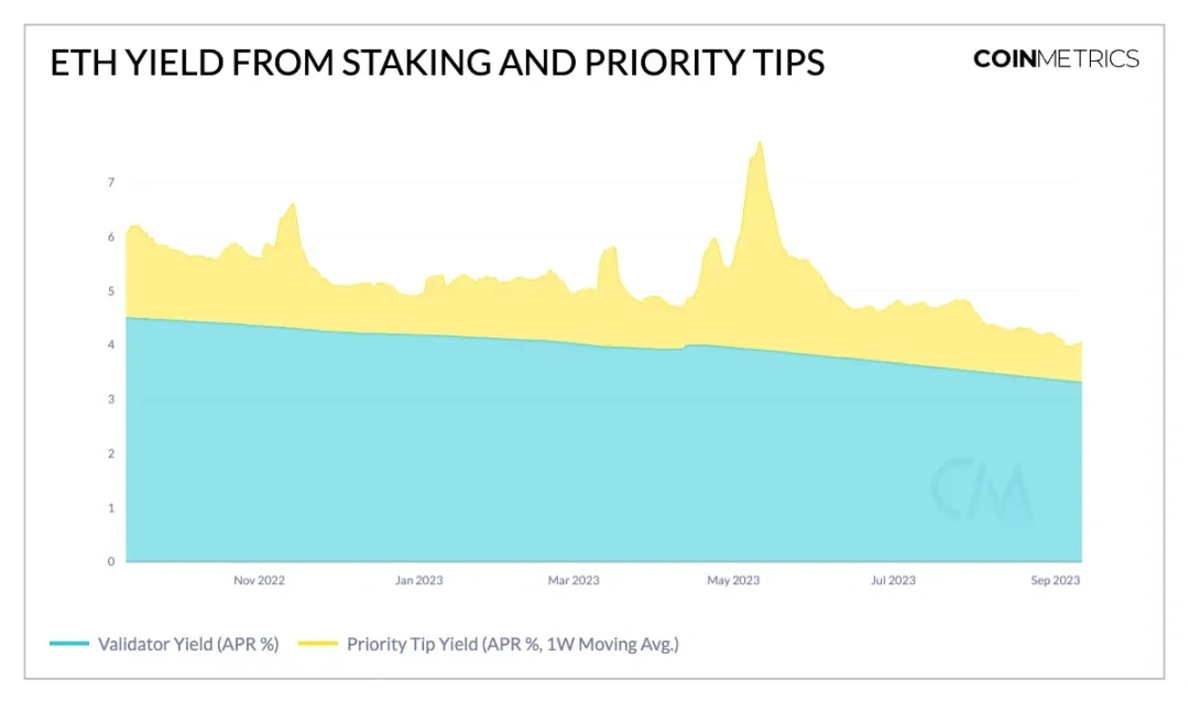 对于网络的安全来说,至关重要的是负责保护和处理交易的代理在经济上是可持续的。然而,随着新验证者加入网络,每个验证者的收益都会减少,因为收入在所有验证者之间共享。验证者的可预测收入来源在过去一年中一直在持续减少,仅在 4 月份启用提款时出现了小幅波动。另一方面,验证者获得的收益是可变的,并且是用户需求和网络活动的函数。过去几个月,优先费用为验证者平均收益率贡献了约 0.7% 至 0.9% 。
