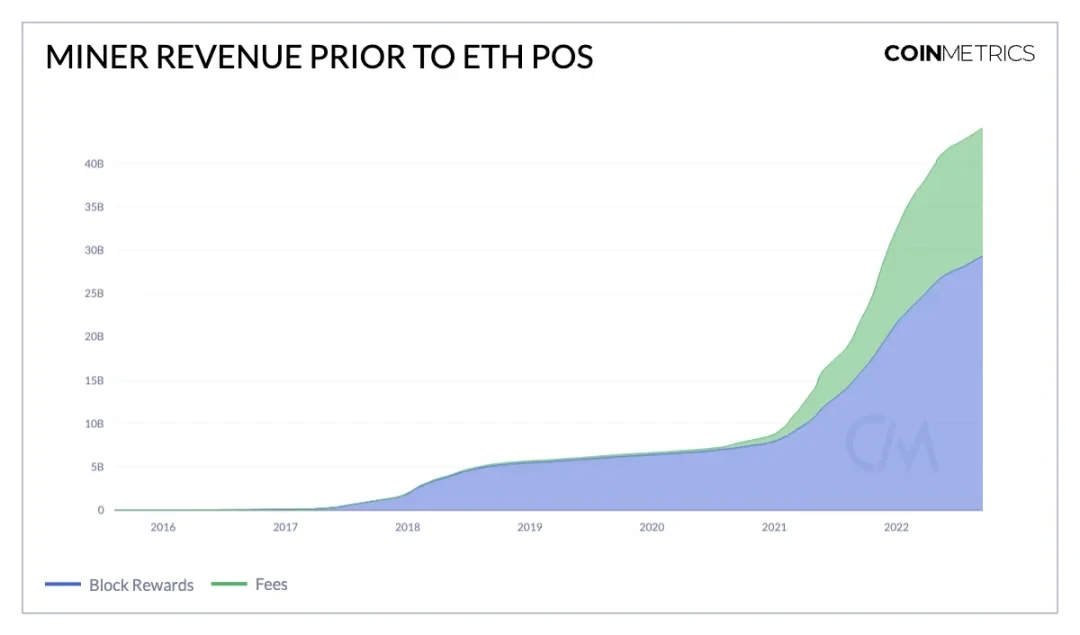 在以太坊工作量证明(PoW)的黄昏时代,挖矿的终结无疑是合并最具影响力的结果之一。在 2022 年 5 月的高峰期,以太坊网络的算力超过 1000 TH/s 。这并不奇怪,因为以太坊挖矿是一个价值数十亿美元的行业,每季度产生超过 20 亿美元的收入,累计收入超过 400 亿美元,其中 300 亿美元来自区块奖励, 113 亿美元来自交易费用。