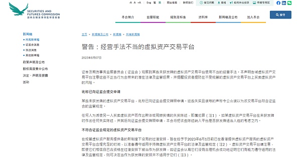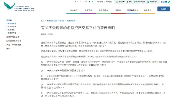 9月13日,香港证监会于官网新闻稿中发布标题为《有关不受规管的虚拟资产交易平台的警告声明》的有关不受规管的虚拟资产交易平台的警告声明。