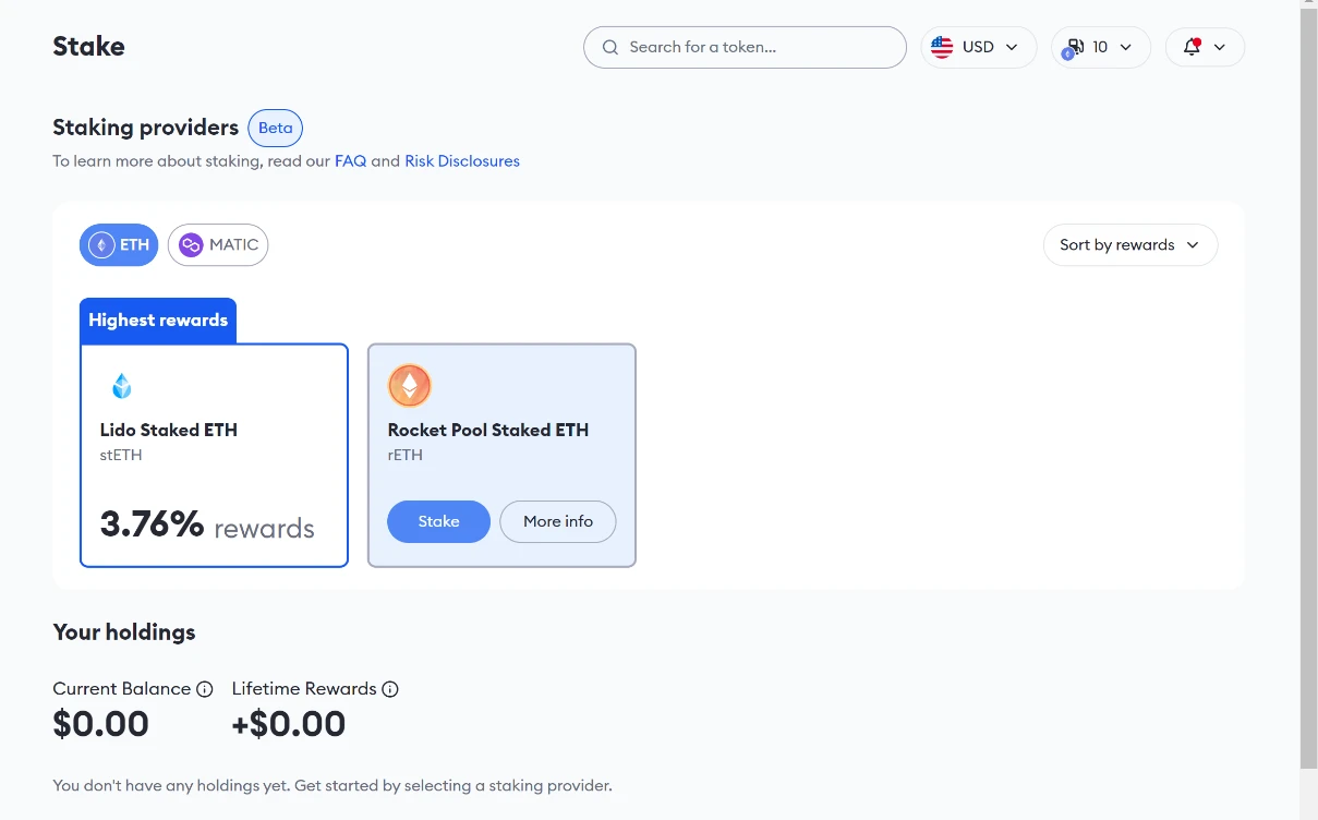 今年 1 月份,MetaMask 推出”Stake“功能。MetaMask Stake 允许用户与 Lido 或 Rocket Pool 进行流动性质押,帮助用户轻松实现 ETH 质押功能。
