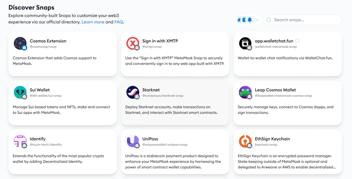 MetaMask Snap 是 MetaMask 推出的用户自定义钱包功能的插件平台,目前内含 34 个第三方创建的 Snap。实现跨平台的交易洞察、通知、互操作性功能。