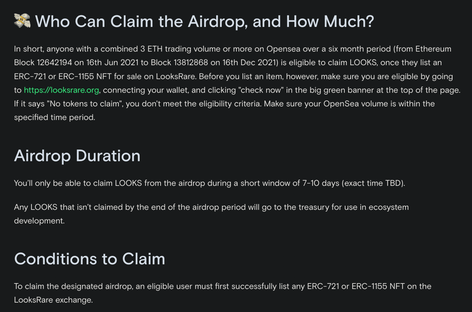 它通过系统筛选,找出在 OpenSea 上的 NFT 交易大户(半年内在 OpenSea 上的交易量累计达 3 ETH 以上),然后直接将这些大户空头列入自己的原生代币 LOOKS 空投白名单——但是,如果这些大户想要领取 LOOKS,则必须先在 LooksRare 上交易 1 个 NFT。